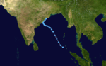 During October 31, the IMD reported that a depression had developed, out of an area of low pressure over the southern Bay of Bengal.[9] The depression subsequently moved towards the northwest and developed into a Deep Depression during November 1, before the JTWC initiated advisories on the system and designated it as Tropical Cyclone 03B early the next day.[2][9] The system continued to move towards the northwest along the western subtropical ridge of high pressure, before it made landfall on southern Odisha during November 3.[2][9] The system subsequently dissipated over land during November 4.[9] The system caused heavy rainfall over Southern Odisha, which led to flash flooding, dams and reservoirs overflowing and over US$110 million worth damage to property and crops.[9][10][11] 250 deaths were also recorded in conjunction with this system.[10][11]