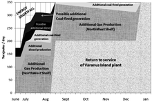 On 23 June 2008, Apache Energy released a statement that said limited production of 200 terajoules of gas from the East Spar Joint Venture would start by 15 August, with full production expected by December.[25] Also on 23 June, the Muja power station came back online. Western Power spokesperson Ken Brown said the plant will provide "very minimal megawatts because it has been out for many months, not just for pure maintenance, it's had a complete overhaul of the machine and the control, and it's going to take quite a while to commission that, but by next week it will be producing some significant coal megawatts and that's really good."[26] Kwinana Unit 1, a power station located at Kwinana closed for maintenance before the explosion, was reactivated on 8 July. The 110 megawatt station operated at 60% capacity for the first few days before running at full capacity.[27] Kwinana Unit 1 is expected to free up to five terajoules of gas daily.[28]