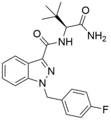 ADB-FUBINACA is a designer drug identified in synthetic cannabis blends in Japan in 2013.[1] The (S) enantiomer of ADB-FUBINACA is claimed in Pfizer patent WO 2009/106982 and has been reported to be a potent agonist of the CB1 receptor and CB2 receptor with an EC50 value of 1.2 nM and 3.5 nM respectively.[2][3] ADB-FUBINACA features a carboxamide group at the 3-indazole position, like SDB-001 and STS-135. ADB-FUBINACA appears to be the product of rational drug design, since it differs from AB-FUBINACA only by the replacement of the isopropyl group with a tert-butyl group.