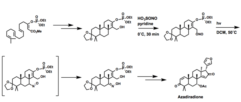 Corey again employed the Barton reaction in the synthesis of Azadiradione, a member of the limonoid family of natural products. In this case, nitrosylsulfuric acid is used in place of nitrosyl chloride.[24]