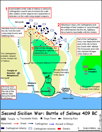 The Battle of Selinus, which took place in the spring of 409 BC, is the opening battle of the so-called Second Sicilian War. The 10-day-long siege and battle was fought in Sicily between the Carthaginian forces under Hannibal Mago (A king of Carthage of the Magonid family, not the famous Hannibal of the Barcid family) and the Dorian Greeks of Selinus. The city of Selinus had defeated the Elymian city of Segesta in 415 BC, an event that led to the Athenian invasion of Sicily in 415 BC and ended in the defeat of Athenian forces in 413 BC. When Selinus again worsted Segesta in 411 BC, Carthage, responding to the appeal of Segesta, had besieged and sacked Selinus after the Carthaginian offer of negotiations had been refused by the Greeks. This was the first step towards Hannibal's campaign to avenge the Carthaginian defeat at the 1st battle of Himera in 480 BC. The city of Selinus was later rebuilt, but never regained her former status.