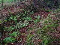 A rocky glen runs up from Monkcastle with a significant waterfall and a listing as part of a Scottish Wildlife Trust local site for nature conservation. The glen was partly formed from quarrying work for freestone.[32] A previous course of the Monkcastle Burn can still be followed and this probably resulted from the quarrying intruding into the original course of the burn at the head of the glen resulting in a watefall and the burn then following the bed of the glen itself. The geology consists of Carboniferous limestone, macroporphyritic basalt, and an overlay of basalt and boulder clay. The quarry workers are thought to have made used of Old Monkcastle as office space for storage, etc. The OS maps show that quarrying had ceased by the start of the 20th century.[33]