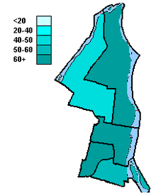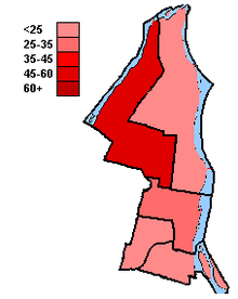 The eastern end of the Island of Montreal was the birthplace of the sovereigntist movement, and remained a sovereigntist stronghold for four decades. Even today, when the Parti Québécois wins provincially, the entire eastern half of the island is coated light blue. Federally, it was the Bloc Québécois's power base from 1993 to 2011, partly due to its leftist bent. With the exception of ethnic areas that protrude from Northern Montreal into the East Island's Honoré-Mercier riding, where Liberal support is strong, the area is relatively homogeneously Francophone and lower-income, a recipe for Bloc dominance. Prior to the rise of the Bloc, the region voted solidly Liberal for decades before being swept up in the Brian Mulroney tide, electing Quebec nationalists under the Progressive Conservative banner. The Conservative Party of Canada has never approached this level of support, and eastern Montreal is currently the weakest region in Canada for the Tories. In 2011, the federalist NDP swept every seat in this region amid the surge of popular support in the province and the concurrent Bloc meltdown, in all but one case by well over 6,000 votes. The NDP surge even cost longtime Bloc leader Gilles Duceppe his seat in Laurier-Sainte-Marie.