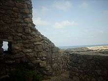 On the summit of the promontory are extensive remains of a Saracenic castle. The town's fortifications formerly extended to the shore, on the side where the modern town now is, in the form of two long walls protecting the port. There are remains of a wall of massive rectangular blocks of stone at the modern Porta Garibaldi on the south.