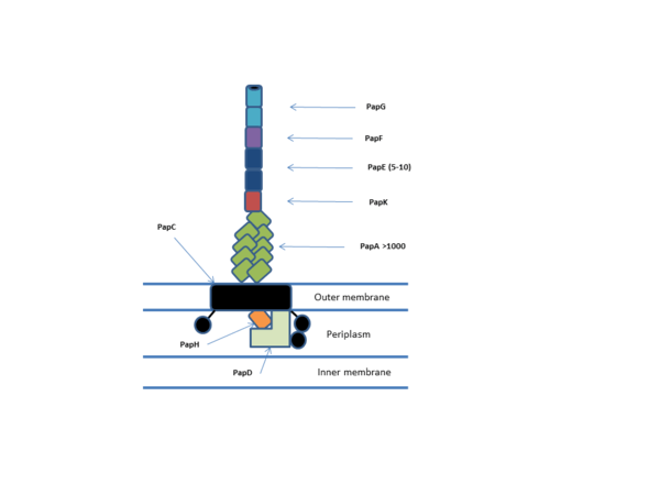 All chaperone/usher systems are found within gene clusters consisting of at least an usher, a chaperone and one or more fimbriae subunits.[1] Overall the system consists on periplasmic chaperones, periplasmic and extracellular pilus subunits, dimeric usher outer membrane pore and associated Sec machinery. The Pilus subunits polymerise via a non-covalent interaction to form the mature pilus which consists of an adhesive tip, helical body and an usher bound base. The P-pilus (pap) system is one of the best characterised and is shown below.[2]