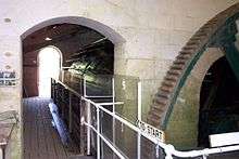 Water is diverted from the river by Warleigh Weir, about 200 yards (183 m) upstream. The water flows to the pumping station down a 30-foot (9.1 m) wide leat, which is crossed by a single segmental arch bridge with a central keystone.[3] The water passes over depressing sluices which can be raised or lowered by hand cranking, and then powers a breastshot water wheel. The 24-foot (7 m) wide wheel is in two sections each 12 feet (3.7 m) wide and 17 feet (5 m) in diameter with a 9-inch (23 cm) gap between them.[4][5] The wheel has 48 wooden "starts", supporting 96 float boards each of which is 13 inches (33 cm) by 1 inch (2.5 cm) by 12 feet (3.7 m) and made of Iroko.[6] The breastshot wheel is vertically mounted, and falling water strikes the blades. Breastshot wheels are less efficient than overshot wheels,[7] more efficient than undershot wheels, and are not backshot.