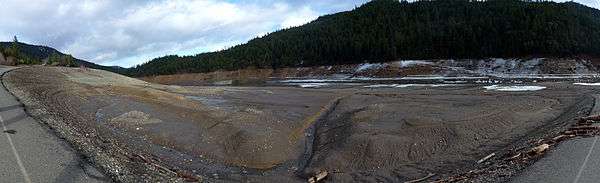 Mud flats at the south end of Applegate Lake where the town of Copper formerly stood. This area is usually submerged beneath over 60 feet (18 m) of water. The road, now a boat ramp, is the remains of the highway that once served Copper.