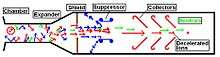 William Barr and Ralph Moir then ran a group which did a series of direct energy conversion experiments through the late 1970s and early 1980s.[6] The first experiments used beams of positives and negatives as fuel, and demonstrated energy capture at a peak efficiency of 65 percent and a minimum efficiency of 50 percent.[7][8] The following experiments involved a true plasma direct converter that was tested on the Tandem Mirror Experiment (TMX), an operating magnetic mirror fusion reactor. In the experiment, the plasma moved along diverging field lines, spreading it out and converting it into a forward moving beam with a Debye length of a few centimeters.[9] Suppressor grids then reflect the electrons, and collector anodes recovered the ion energy by slowing them down and collecting them at high-potential plates. This machine demonstrated an energy capture efficiency of 48 percent.[8] However, Marshall Rosenbluth argued that keeping the plasma's neutral charge over the very short Debye length distance would be very challenging in practice, though he said that this problem would not occur in every version of this technology.[9]