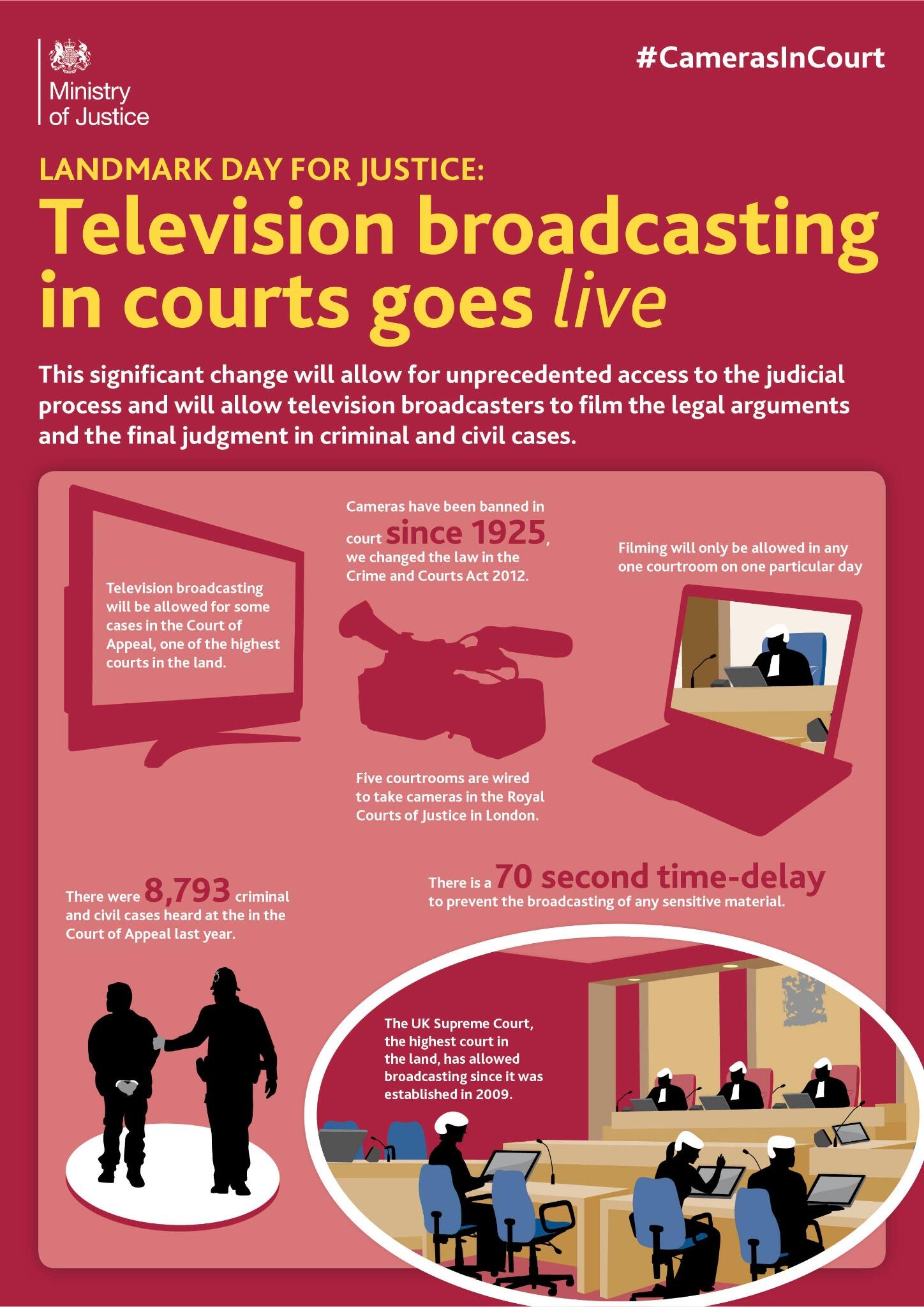 On 31 October 2013 the Court of Appeal allowed cameras in the court for a (70-second broadcast delay) "live" broadcast feed for the first time.[32] Cameras were banned in all courts in 1925 (although they were allowed in the UK Supreme Court from its 2009 inception). Cameras have now been allowed in some courts due to changes made by the Crime and Courts Act 2013. Currently, only one court can be broadcast per day.[33] The Ministry of Justice announced the move via Twitter.[34]