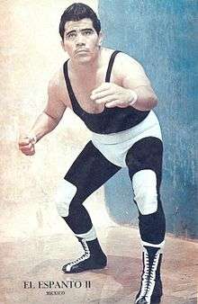 On June 12, 1962 Espanto II won his first ever Lucha de Apuestas, or "bet match", defeating Tomás Riande and thus forcing him to be shaved bald as a result.[4] In lucha libre the Lucha de Apuesta victory is considered the highest "prize" that a wrestler can win, more so than championships.[5] Two months later he won the hair of Álvaro Velazco in a match in Mexico City.[4] Those two Apuesta matches were part of a buildup towards one of the feature matches of the 1st EMLL 30th Anniversary Show, held on September 6, 1963. At the show Rubén Juárez defeated Espanto II in a Lucha de Apuesta, forcing Espanto to unmask.[4][6] After unmasking he gave his birth name as "Fernando Vázquez Cisneros", using a combination of his and his partners' paternal last names to maintain the story that the Espantos were brothers.[3] A few weeks later Espanto I gained a measure of revenge for his team as he defeated Rubén Juárez as part of the 2nd EMLL 30th Anniversary Show.[6] In November 1962 Espanto I and II were joined by Espanto III, Euseibo's younger brother Miguel, forming a regular trio.[2] At the same time Espanto I and II also regularly teamed up with El Santo, often headlining EMLL shows across Mexico. Teaming with El Santo was part of a storyline where Espanto I and II would attack El Santo after a match, turning Santo to the tecnico side (those that portray the "good guys") in the process. On Jun 22, 1963, Espanto I, II and El Santo lost a match to Rito Romero, Rayo de Jalisco, and Henry Pilusso. Being disappointed with the loss Espanto II attacked El Santo, but ended up with his own mask torn up and his face covered in blood when El Santo fought back.[7] In the buildup to the mask vs. mask match between Espanto I and El Santo, El Santo defeated Espanto II in a Lucha de Apuesta match in late 1963, forcing Espanto II to have all his hair shaved off.[7] A couple of months later El Santo would unmask Espanto I, who also stated that his last name was "Vázquez Cisneros".[3][4]