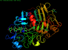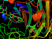 CBH1, for example, is composed of a carbohydrate binding site, a linker region and a catalytic domain.[2] Once the cellulose chain is bound, it is strung through a tunnel-shaped active site where the cellulose is broken down into two-sugar segments called cellobiose.[2][3] The structure of the enzyme can be seen in the first figure. The second figure shows the activity of the enzyme, and shows both cellulose binding to the enzyme, as well as the product of this step, cellobiose. Research suggests, however, that the activity of CBH1 is very strong inhibited by the product, cellobiose. Determination of an enzyme that is not as strongly inhibited by the product or finding a way to remove cellobiose from the environment of the enzyme are just more examples of the many challenges that face the use of these enzymes for the creation of biofuels.[4]