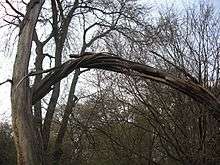 Trees can explode when struck by lightning.[3][15][16][17] The strong electric current is carried mostly by the water-conducting sapwood below the bark, heating it up and boiling the water. The pressure of the steam can make the trunk burst.[3][17] This happens especially with trees whose trunks are already dying or rotting.[3][18][19] The more usual result of lightning striking a tree, however, is a lightning scar, running down the bark, or simply root damage, whose only visible sign above ground is branches that were fed by the root dying back.[17][20]