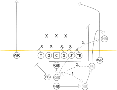 After the snap the quarterback hands off or laterals the football to a running back or another player on his team, who then runs towards or parallel to the line of scrimmage. Before the running back crosses the line of scrimmage, he laterals the football back to the quarterback, who looks to pass to an eligible receiver.[2][3]