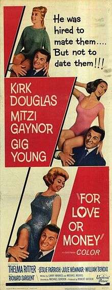 For Love or Money is a 1963 romantic comedy film starring Kirk Douglas, Mitzi Gaynor and Gig Young. To date, this remains the last film made by Gaynor.