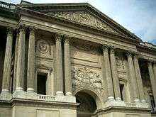 France Crowning Art and Industry (French: La France couronnant l'Art et l'Industrie) is a 6.50 m (21 ft) tall[1] limestone sculpture group which decorated the top of the entrance of Palais de l'Industrie, the main building of the 1855 international exhibition in Paris. It was moved to the park of Saint-Cloud in 1900 when the palais de l'Industrie was demolished. The center group, composed of the three allegories (France, Art and Industry) is a work by sculptor Élias Robert. The two putti groups located on its sides are by Georges Diebolt. The wreaths France was carrying in her hands and most of the rays of the radiant crown she wears have now disappeared.