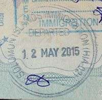 - ↑ Though stamps are issued upon both arrival and departure, there are only minor differences. The first 3 numbers after the date are assigned to the various points of entry and exit. The next number indicates entry or exit, '1' for entry, '2' for exit. The four digit number along the right edge is the Federal Police agent that made the stamp.