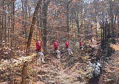 The 225-acre[2] Outdoor Education Center occupies a small cluster of buildings near the park entrance. Those include four cabins with 96 beds, dining lodge and a bathhouse.[3] The center offers team development courses, overnight retreats, summer camps, and corporate training workshops, that use a hands-on methodology to teach cooperation and communication through challenges which can be only solved as a team. One of the main attractions is their zip line. Its programs, are open to the public by reservation and serve 20,000-30,000 people a year.
