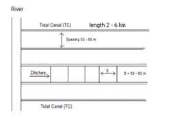 Between the tidal canals additional lateral ditches have been dug perpendicularly at a spacing of 50 to 60 m to further promote the distribution of the irrigation water.