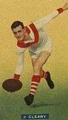 Cleary played as a fullback and won two best and fairest awards for South Melbourne, in 1942 and 1944. His reputation was marred somewhat by his involvement in what is referred to as the 1945 VFL Grand Final 'bloodbath'. For his part in the incident he was suspended for 8 matches. He left the club in 1949 and went on to become captain and coach of Victorian Football Association club Port Melbourne; he coached there from 1949 until 1952, leading the club to consecutive minor premierships and Grand Final losses in 1951 and 1952; he then coached at fellow VFA clubs Brunswick (from 1953 until 1958) and Dandenong (from 1959 until 1961), coaching a total of 267 VFA games.[2] He remained involved in the game even after retiring as a coach, becoming a panelist on a TV show called 'World of Sport'.