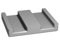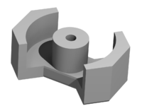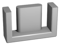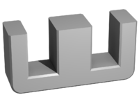 Again used for iron cores. Similar to using an "E" and "I" together, a pair of "E" cores will accommodate a larger coil former and can produce a larger inductor or transformer. If an air gap is required, the centre leg of the "E" is shortened so that the air gap sits in the middle of the coil to minimize fringing and reduce electromagnetic interference.