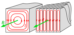 (left) Eddy currents (I, red) within a solid iron transformer core. (right) Making the core out of thin laminations parallel to the field (B, green) with insulation between them reduces the eddy currents. In this diagram the field and currents are shown in one direction, but they actually reverse direction with the alternating current in the transformer winding.