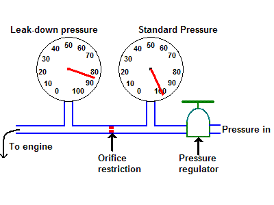 There is no standard regarding the size of the restriction orifice for non-aviation use and that is what leads to differences in readings between leak-down testers generally available from different manufacturers. Most often quoted though is a restriction with a .040in. hole drilled in it. Some poorly designed units do not include a restriction orifice at all, relying on the internal restriction of the regulator, and give much less accurate results. In addition, large engines and small engines will be measured in the same way (compared to the same orifice) but a small leak in a large engine would be a large leak in a small engine. A locomotive engine which gives a leak-down of 10% on a leak-down tester is virtually perfectly sealed while the same tester giving a 10% reading on a model airplane engine indicates a catastrophic leak.