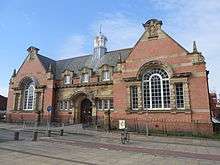 1896 | A branch library built in brick and stone, with a tiled roof. It is in two storeys with three gabled bays, and has an octagonal turret in the corner. The windows are mullioned and transomed, and there are four round columns at the entrance.[13][14] | II |