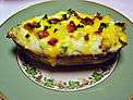 | Twice-baked potato | | Prepared using baked potatoes, the interior of the potato is scooped out after being first-baked. Additional ingredients are added to the potato that is scooped out, and the mix is then placed in the potato shells and baked again.[16] Pictured is a twice baked potato with cheddar cheese, bacon and green onion topping. | |