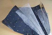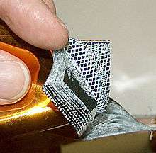 The layers of MLI can be arbitrarily close to each other, as long as they are not in thermal contact. The separation space only needs to be minute, which is the function of the extremely thin scrim or polyester 'bridal veil' as shown in the photo. To reduce weight and blanket thickness, the internal layers are made very thin, but they must be opaque to thermal radiation. Since they don't need much structural strength, these internal layers are usually made of very thin plastic, about 6 micrometres (1/4 mil) thick, such as Mylar or Kapton, coated on one side with a thin layer of metal on both sides, typically silver or aluminium.[1] For compactness, the layers are spaced as close to each other as possible, though without touching, since there should be little or no thermal conduction between the layers. A typical insulation blanket has 40 or more layers.[1] The layers may be embossed or crinkled, so they only touch at a few points, or held apart by a thin cloth mesh, or scrim, which can be seen in the picture above. The outer layers must be stronger, and are often thicker and stronger plastic, re-enforced with a stronger scrim material such as fiberglass.