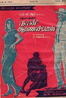 Naan Aanaiyittal is a 1966 Tamil language drama film directed by Chanakya. The film features M. G. Ramachandran and B. Saroja Devi in lead roles. The film, produced by R. M. Veerappan under Sathiya Movies, had musical score by M. S. Viswanathan.[1] The film ran for 60 days.The film is named after the legendary song from MGR 's blockbuster hit ENGA VEETU PILLAI[2]