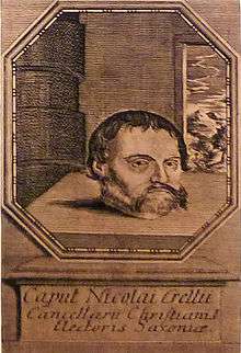 Nikolaus Krell (c. 1551 – 9 October 1601), chancellor of the elector of Saxony, was born at Leipzig, and educated at the university of his native town.