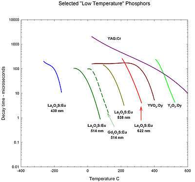 Phosphor thermometry is an optical method for surface temperature measurement. The method exploits luminescence emitted by phosphor material. Phosphors are fine white or pastel-colored inorganic powders which may be stimulated by any of a variety of means to luminesce, i.e. emit light. Certain characteristics of the emitted light change with temperature, including brightness, color, and afterglow duration. The latter is most commonly used for temperature measurement.