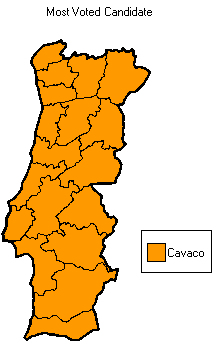 The 2011 Portuguese presidential election was held on 23 January 2011. This election resulted in the re-election of Aníbal Cavaco Silva to a second term as President of Portugal. Turnout in this election was very low, where only 46.52% of the electorate cast their ballots. Cavaco Silva won by a landslide winning all 18 districts, both Autonomous regions of Azores and Madeira and 292 municipalities of a total of 308.