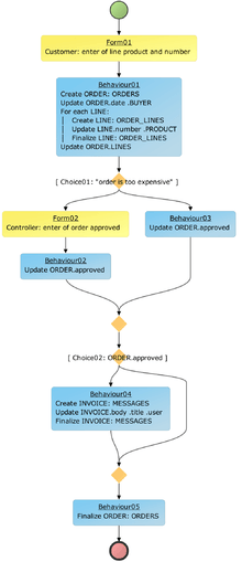 Define the requirements clearly. Use if-then-else to define 'When' results should apply or should be produced. 'Where' the information is coming from is defined using references. For instance ORDER.approved is a piece of available information that is either produced during the process or is already an available piece of information. Some requirements (results) can be specified visually. To your right the "Customer has an invoice" is specified as an e-mail.
