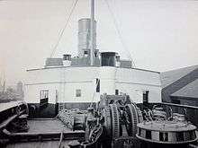 A powerful steam windlass was situated forward on the shelter deck for working the anchors, which were arranged to be stowed in hawse pipes, and two large capstans were fitted aft on the shelter deck for warping purposes.[4] A combined steam and hand steering engine was also located aft, and this was controlled by a telemotor gear from the navigating bridge.[4] There was also a powerful steering gear situated forward, the purpose of which was to operate a bow rudder so as to facilitate the quick turning and manoeuvring of the vessel when entering or leaving port.[4]For the stern rudder there was a combined steam and hand gear.