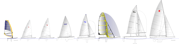 | Class | Type | Event | Sailors | Trapeze | Mainsail | Jib/Genoa | Spinnaker | First OG | Olympics so far |