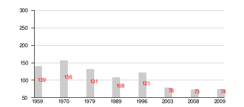 | Year | 1959 | 1970 | 1979 | 1989 | 1996 | 2003 | 2008 | 2009 |