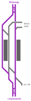 Seestraße station first opened on 8 March 1923 (designed by Grenander/Fehse/Jennen) and was at that time the terminus of the newly built line from Stettiner Bahnhof (now Naturkundemuseum).[1] The station consists of two platforms, the more westerly of which is an island platform with two tracks. In normal service, only the two outer tracks are used. The middle track is principally used for access to the large depot located just north of the station, but is also used for service trains which are beginning or terminating in the station. 1955 the station was renovated by B. Grimmek.