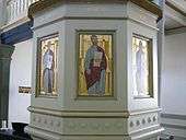 The church's interior reflects the restoration carried out in 1960 under the leadership of Rolf Graae in collaboration with Paul Høm from nearby Gudhjem who contributed the church's colourful artwork. The pulpit is decorated with paintings of the four evangelists while a mosaic above the chancel arch depicts one of the oldest symbols of Christianity, the Paschal Lamb with the flag of victory and the chalice of blood. In 1974, the collaboration between Graae and Høm continued when they designed the facade for the new organ built by Bruno Christiansen and Sons from Jutland. Finally, in 1981 Høm completed the large paintings behind the altar: the dark-blues of Jesus' burial surmounted by the golden tones of the risen Christ.[4]
