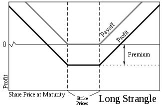 The long strangle involves going long (buying) both a call option and a put option of the same underlying security. Like a straddle, the options expire at the same time, but unlike a straddle, the options have different strike prices. A strangle can be less expensive than a straddle if the strike prices are out-of-the-money. The owner of a long strangle makes a profit if the underlying price moves far enough away from the current price, either above or below. Thus, an investor may take a long strangle position if he thinks the underlying security is highly volatile, but does not know which direction it is going to move. This position is a limited risk, since the most a purchaser may lose is the cost of both options. At the same time, there is unlimited profit potential.[1]