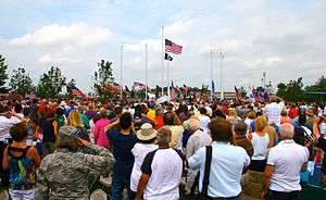 Initial construction of the memorial took roughly seven weeks and was completed in mid-August 2009. The memorial was formally dedicated on August 18, 2009 before a crowd of more than 1,500 people.[2] Retired U.S. Army General and former U.S. Secretary of State Colin L. Powell delivered the keynote address.[3] A crowd of several hundred people gathered one year later, on August 18, 2010, for a re-dedication ceremony to commemorate the completion of a major expansion effort necessitated by the popularity of the memorial among interested donors.[4][5]