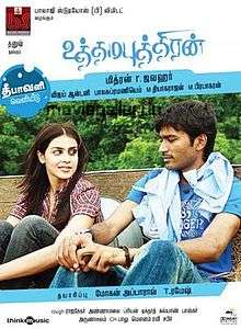 Uthama Puthiran (English: Ideal Son) is a 2010 Indian Tamil-language romantic comedy film directed by Mithran Jawahar. A remake of the 2008 Telugu film Ready, it stars Dhanush and Genelia D'Souza, reprising her role from the original version, in the lead roles;[1] the supporting cast includes K. Bhagyaraj, Vivek, Ashish Vidyarthi and Jaya Prakash Reddy among others. The film received positive reviews from critics and ended up as a commercial success among 2010 Deepavali releases along with Mynaa. The movie was dubbed in Hindi as "Rakhwala No. 1". .[2]